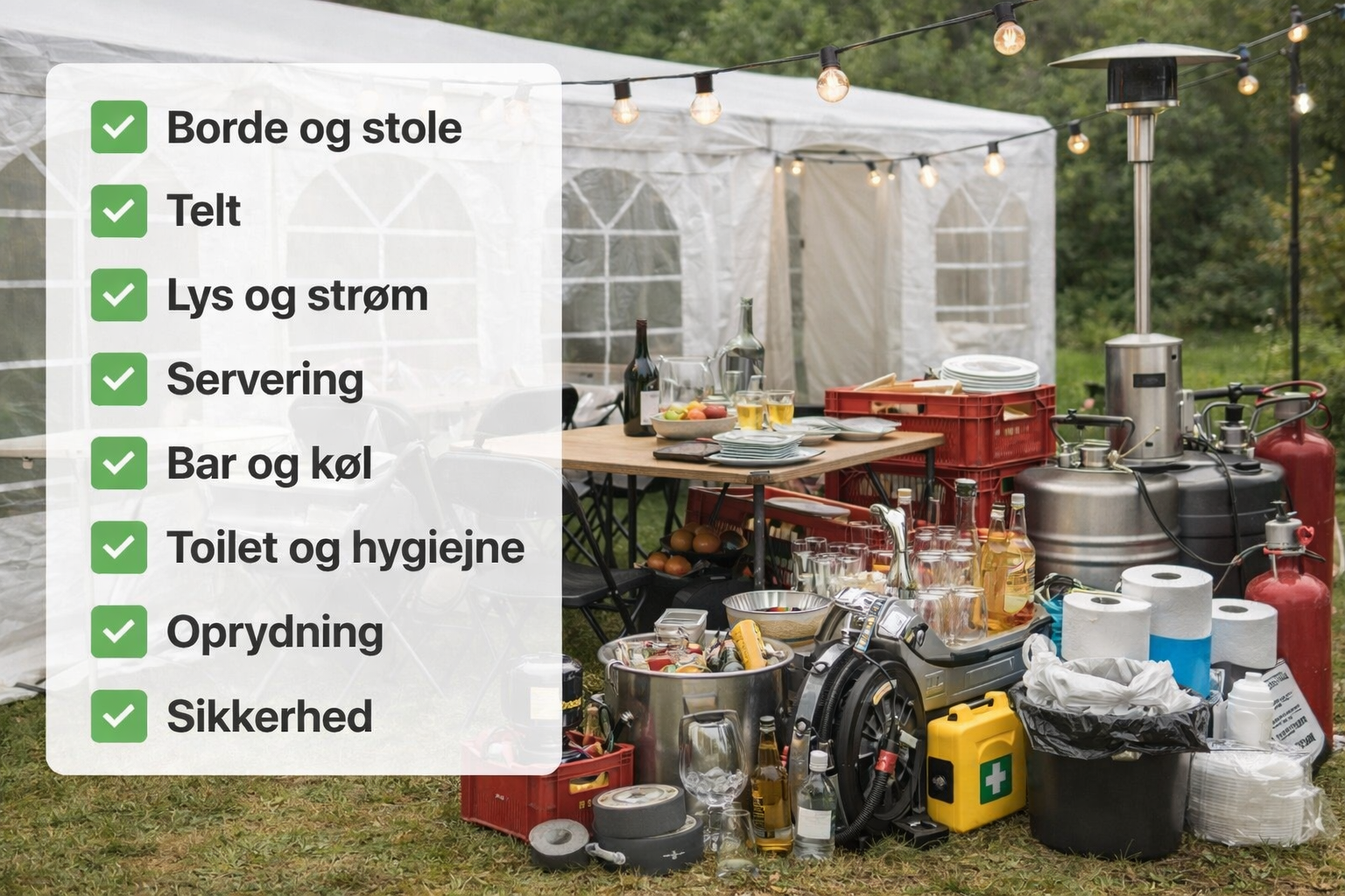 En “god fest” er sjældent et mirakel. Det er logistik, der er løst på forhånd, så du kan være vært i stedet for brandmand. Hvis I vil gøre det nemt for jer selv, så tænk i at leje de tunge ting, få det sat rigtigt op, og brug jeres energi på gæsterne.