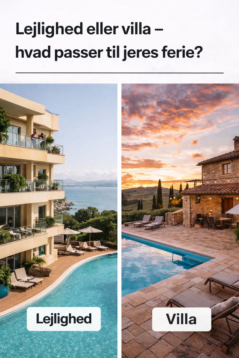 I denne guide gennemgår vi fordele og ulemper ved både lejlighed og villa, så I kan træffe et valg, der passer til jeres behov – ikke bare jeres destination.